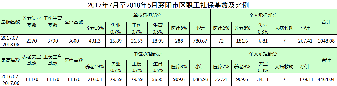 :1、個(gè)人基數(shù)以員工本人上年月均工資為基礎(chǔ),十舍五入保留至十元位,但不得高于2015年度襄陽(yáng)市社平月工資3560元的300%,養(yǎng)老保險(xiǎn)和失業(yè)保險(xiǎn)基數(shù)不得低于社平工資的60%,工傷保險(xiǎn)和失業(yè)保險(xiǎn)基數(shù)按社平工資3790計(jì)算,醫(yī)療險(xiǎn)基數(shù)按社平工資的95%。